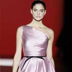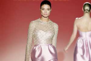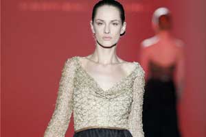 El legendario corte al bies continua hechizando al diseñador, quien en esta ocasión lo utiliza en piezas circulares construidas a base de nesgas y faldas tulipa de corola invertida. Un collage de vestidos en mikado de seda, salpicados por bordados de oro y nácar, delicadamente velados por finas capas de organza; el resultado, equilibrado y preciso, recuerda el laborioso arte del damasquinado. Los suntuosos tejidos gofrados de seda natural dan forma a chaquetas sofisticadas y pantalones “tallo”, que se cuelan entre sus vestidos de noche, como platónicos invitados. También dentro sus propuestas, adquiere importancia la T-Shirt joya; trabajada con efectos de relieve, mediante hilos de soutache o tejidas en macramé con pepitas de oro.